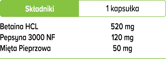 Składniki suplementu w kapsułkach Betaina HCL + pepsyna + mięta pieprzowa