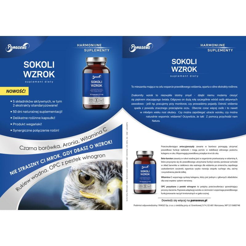 Składniki: Ekstrakt z owoców czarnej borówki (Vaccinium myrtillus) standaryzowany na zawartość min. 25% antocyjanów, ekstrakt z owoców aronii (Aronia melanocarpa)standaryzowany na zawartość min. 15% antocyjanów, kwas L-askorbinowy (witamina C), inulina; ekstrakt z liści rukwi wodnej (Nasturtium officinale) DER 20:1, ekstrakt z pestek winogron (Vitis vinifera) standaryzowany na zawartość min. 95% OPC (oligomeryczne proantocyjanidyny). Skład kapsułki: celuloza roślinna.