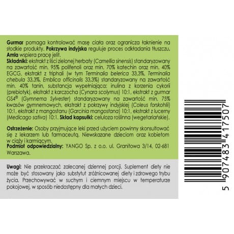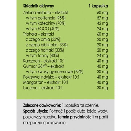 Składniki: Ekstrakt z zielonej herbaty (Camelia sinensis) standaryzowany na zawartość min. 95% polifenoli oraz min. 70% katechin oraz min. 40% EGCG, ekstrakt z triphali (w tym Terminalia belerica 33,3%, Terminalia chebula 33,3%, Emblica officinalis 33,3%) standaryzowany na zawartość min. 40% tanin, substancja wypełniająca: inulina z korzenia cykorii (prebiotyk) , ekstrakt z karczocha (Cynara scolymus) 10:1, ekstrakt z gurmar (Gymnema Sylvester) standaryzowany na zawartość min. 75% kwasów gymnemowych, ekstrakt z pokrzywy indyjskiej (Coleus forskohlii) 10:1, ekstrakt z mangostanu (Garcinia mangostana) 10:1, ekstrakt z lucerny (Medicago sativa) 10:1. Skład kapsułki: celuloza roślinna (wegetariańskie)